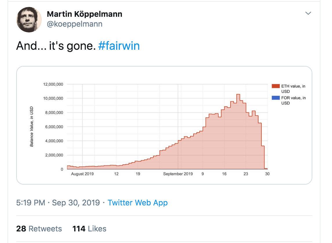 Gnosis co-founder Martin Koppelmann tweets out the value of the smart contract that powered the Fair Win game. Widely panned as a ponzi scheme, it was popular in Asia. The game's activity had been clogging up the Ethereum network, with the smart contract spending twice as much on gas over past 30 days than its nearest competitor, Tether, according to ETH Gas Station.