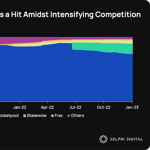 With market stagnation in DEXs and lending protocols, DeFi’s most competitive and interesting battle is for ETH’s LSD or liquid staking derivatives. Staking ETH earns you a nice 4.3% yield but that means you have to lock up your ETH. ETH LSDs are liquid tokens that represent a claim on staked ETH. The most popular one is Lido’s stETH, which has a 70% market share, but Coinbase’s cbETH has chipped into Lido’s lead in recent months. Lido has the first mover advantage, which is why it is so ingrained into DeFi protocols as Dragonfly’s Tom Schmidt points out in the tweet above.