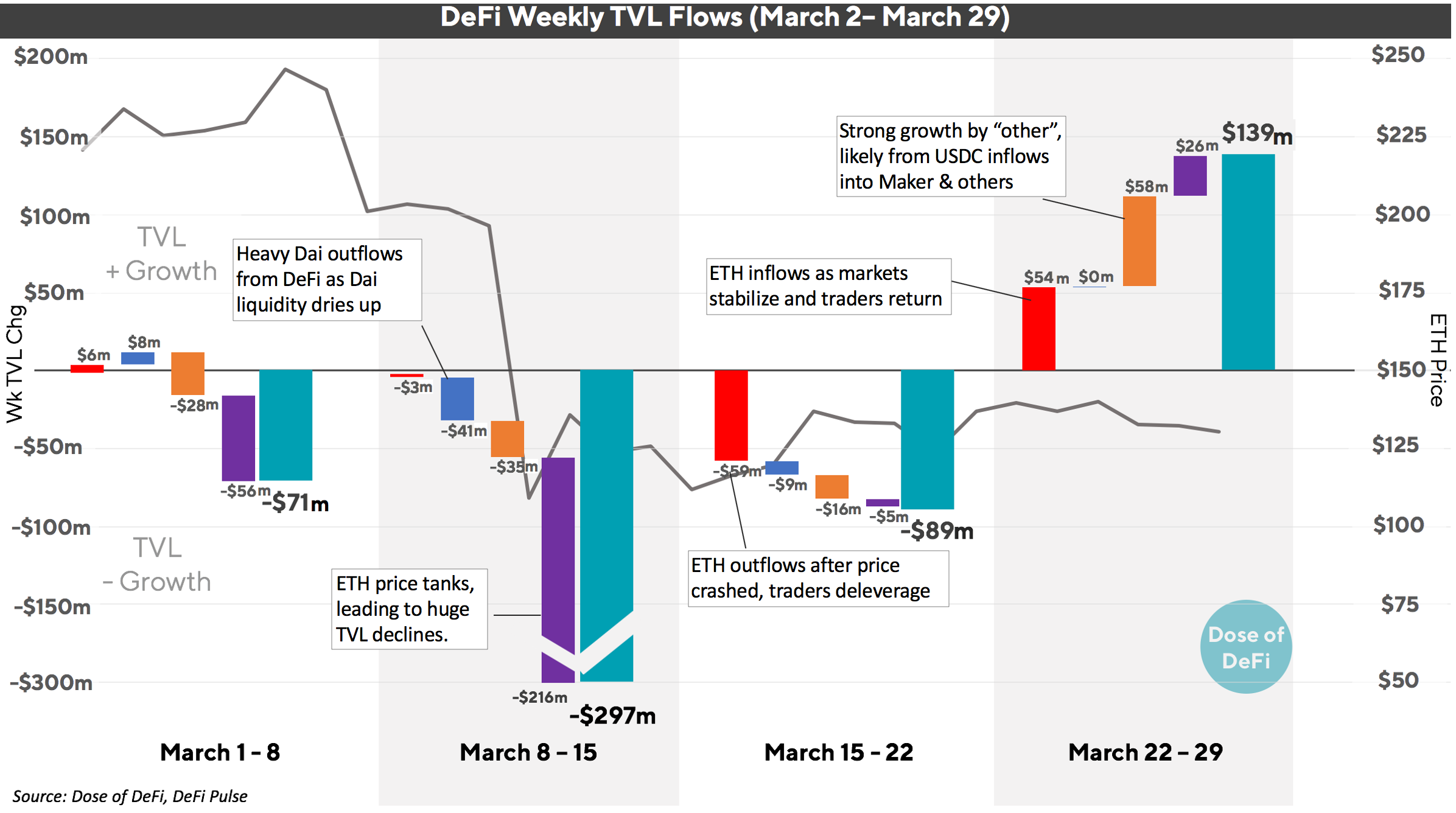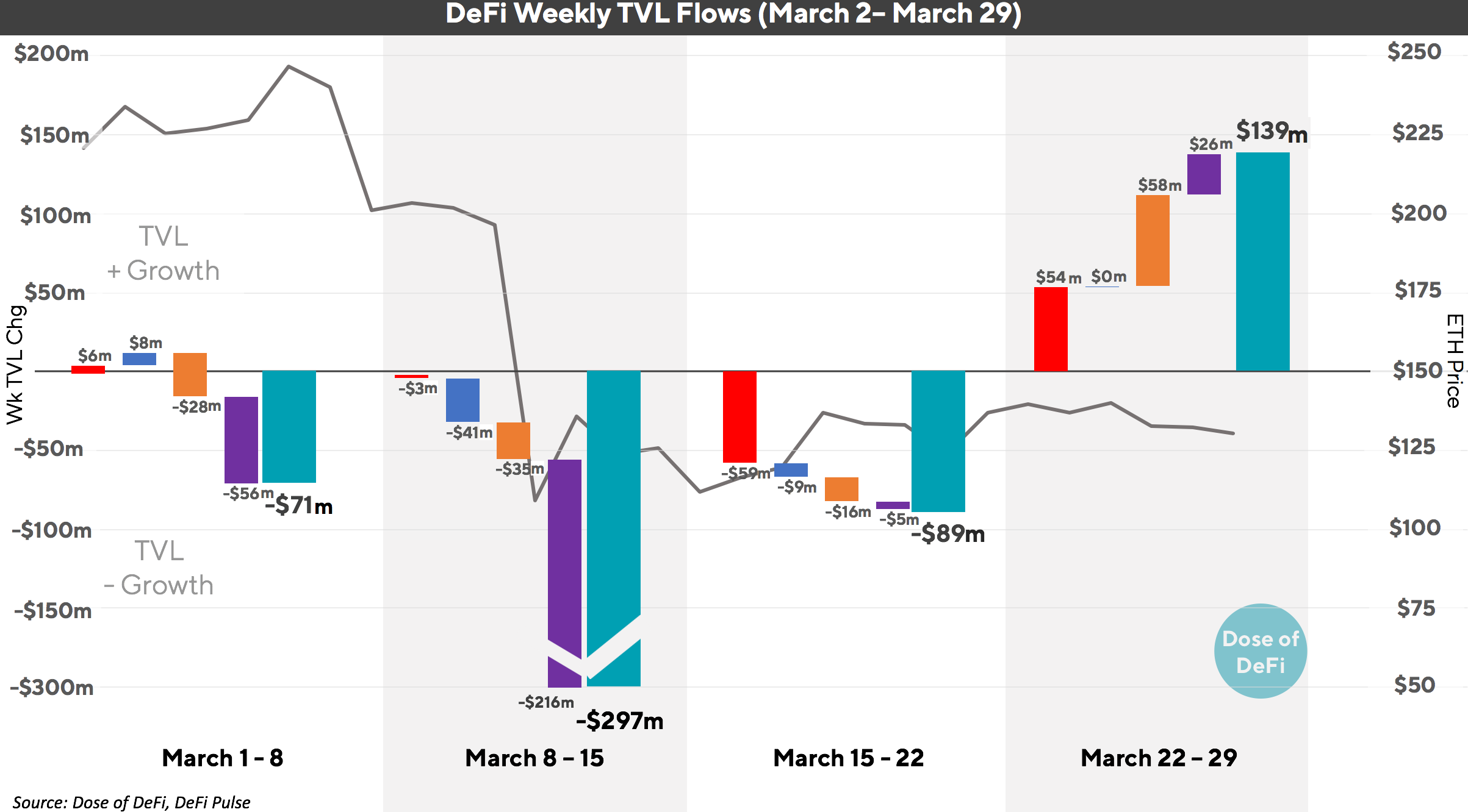 “Gain/Loss from ETH price change” - More than flows, the declining price of ETH had the biggest effect on DeFi TVL, knocking out more than $200m in value during the second week of March.