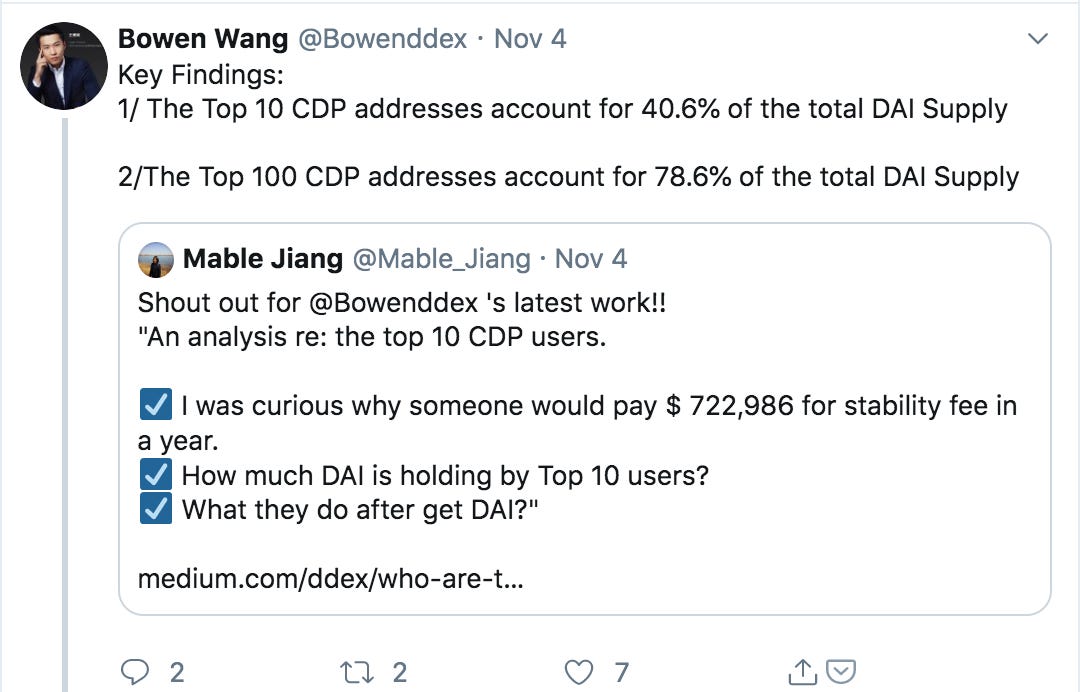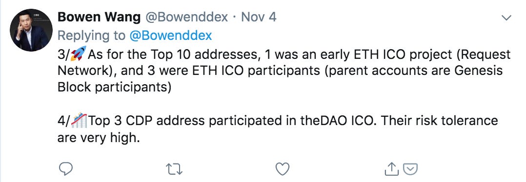 DDEX founder Bowen Wang explores the Ethereum addresses of the 10 largest CDP holders. He finds that several were participants in the ETH ICO along with other interesting on-chain tidbits.