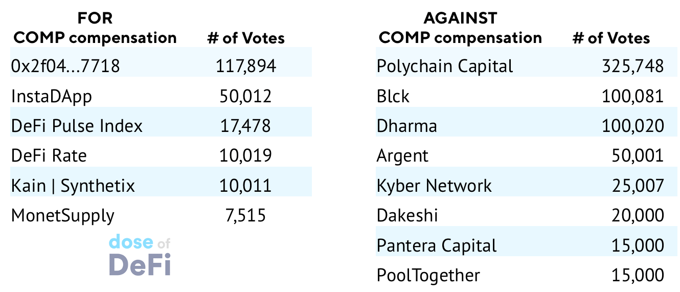 Those voting FOR the proposal are rising protocol politicians and the address that submitted the proposal. Kain explained his FOR vote in a thoughtful tweetstorm citing the “indirect alignment between COMP holders and depositors”. Meanwhile, DeFi Pulse Index voted FOR the compensation on Compound, but its Snapshot page signals AGAINST compensation right now.