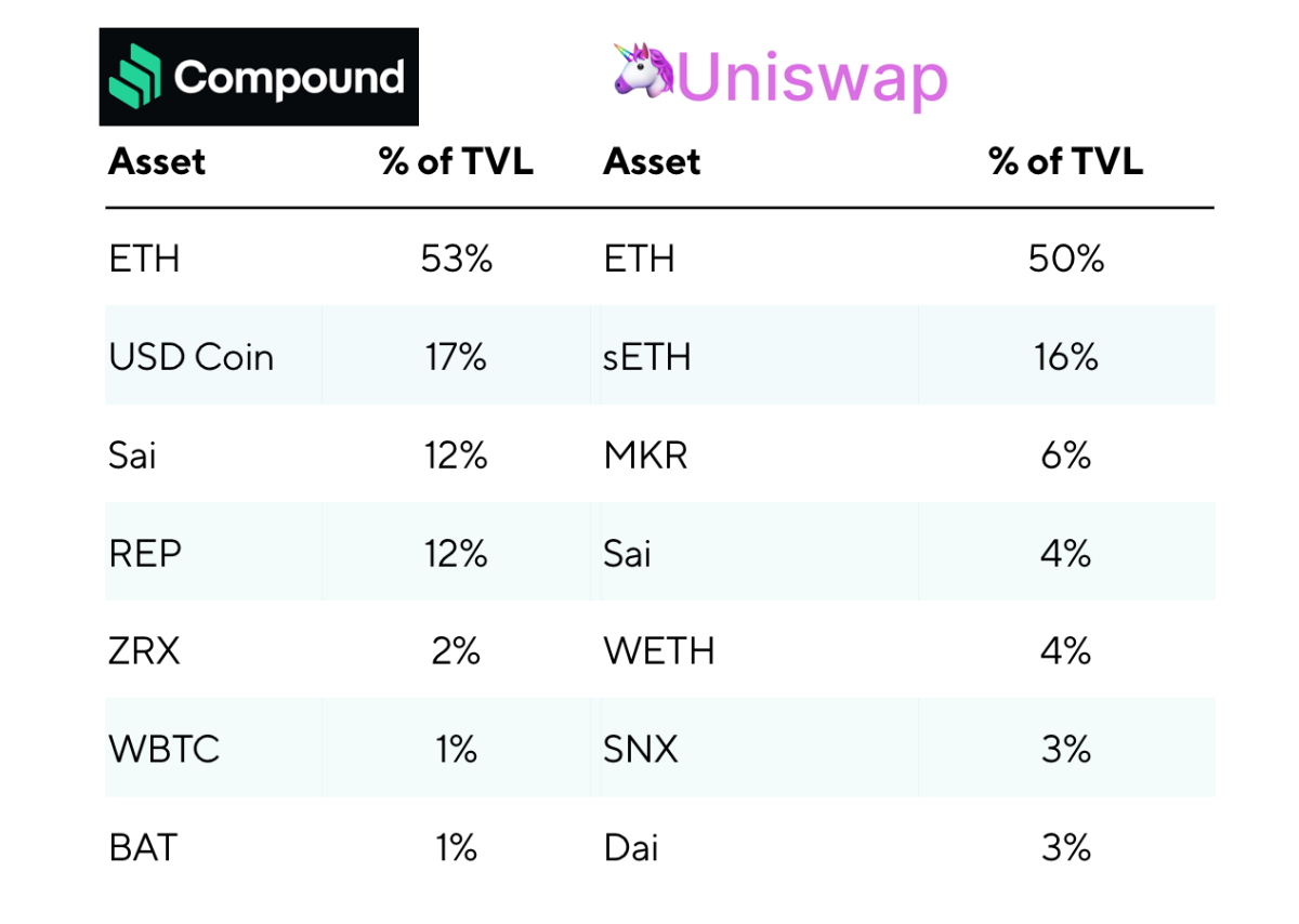 Compound and Uniswap are the furthest ahead in this regard. For every asset added to Uniswap, there must be a corresponding amount in ETH contributed also, so ETH must be 50% of locked up assets.