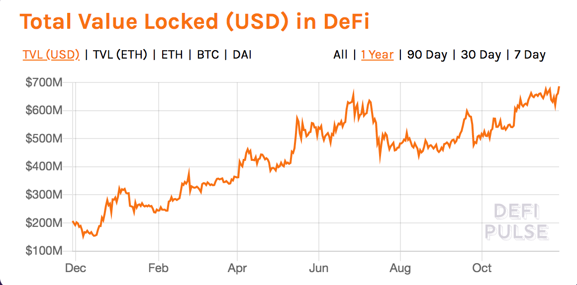 At the moment, there’s just under $700m locked in DeFi, according to DeFi Pulse. That number has been on a steady climb over the past year.