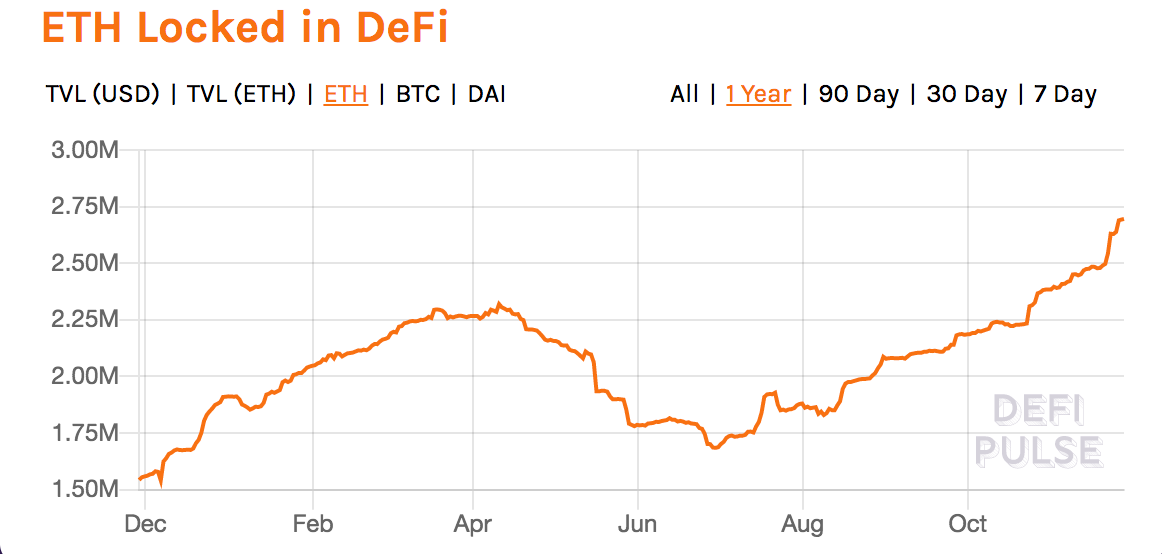 In terms of assets locked in DeFi, ETH is twice as large as all the other assets combined.