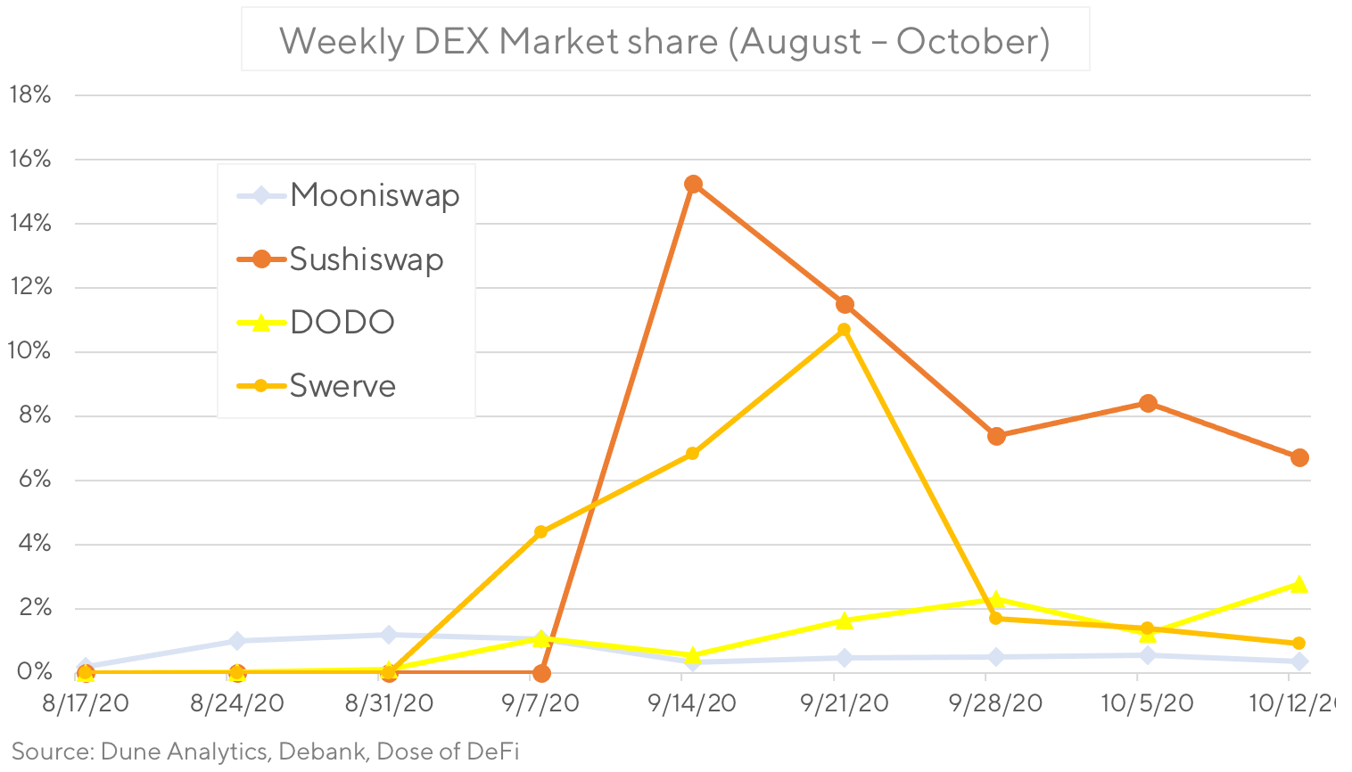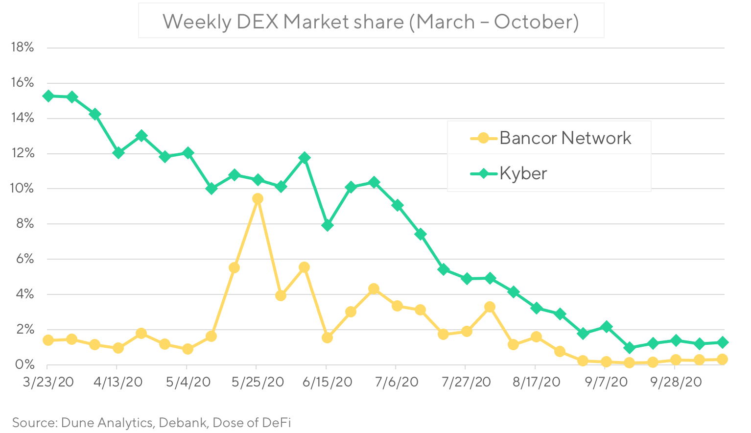 0x struggled for most of the summer but has rebounded over the last month, posting a 7% market share over the last week, thanks to the success of its aggregator Matcha and Tokenlon, a relayer integrated with imToken. It’s not clear what’s in store for Oasis.