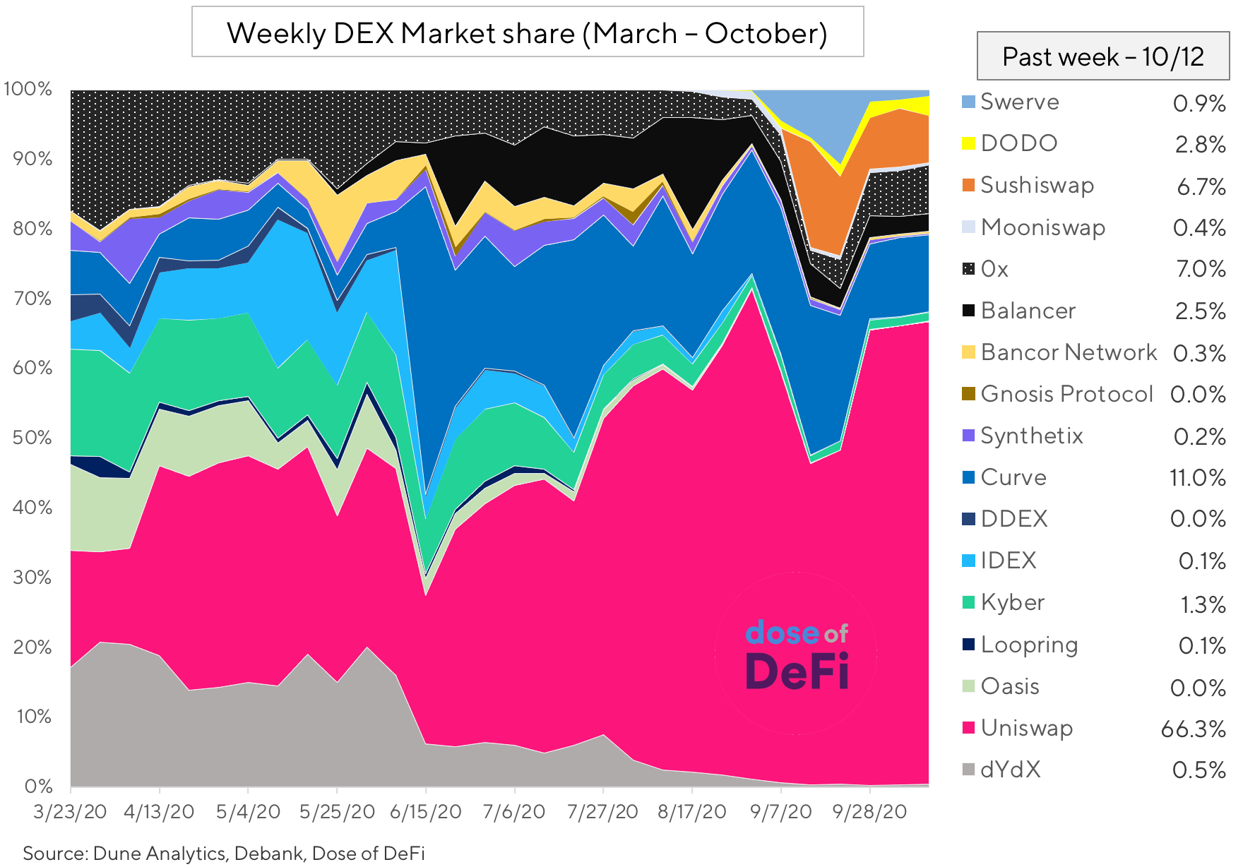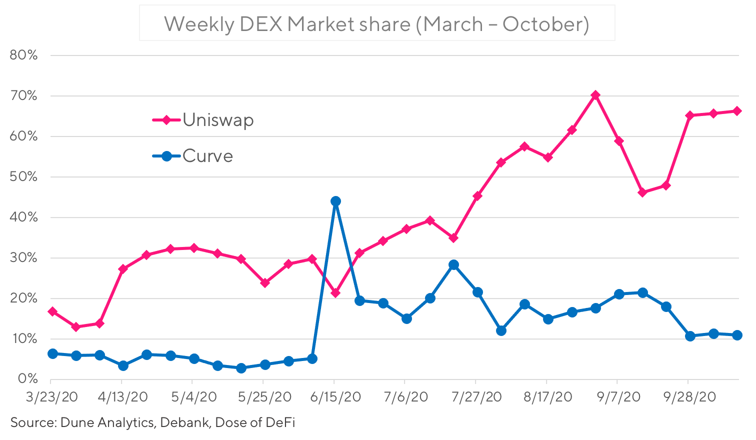 In September, Uniswap overtook Coinbase with a staggering $15.4bn in monthly volume - a 100x increase since April. Uniswap has risen to the top of a crowded DEX field and now commands a healthy 60%+ marketshare.