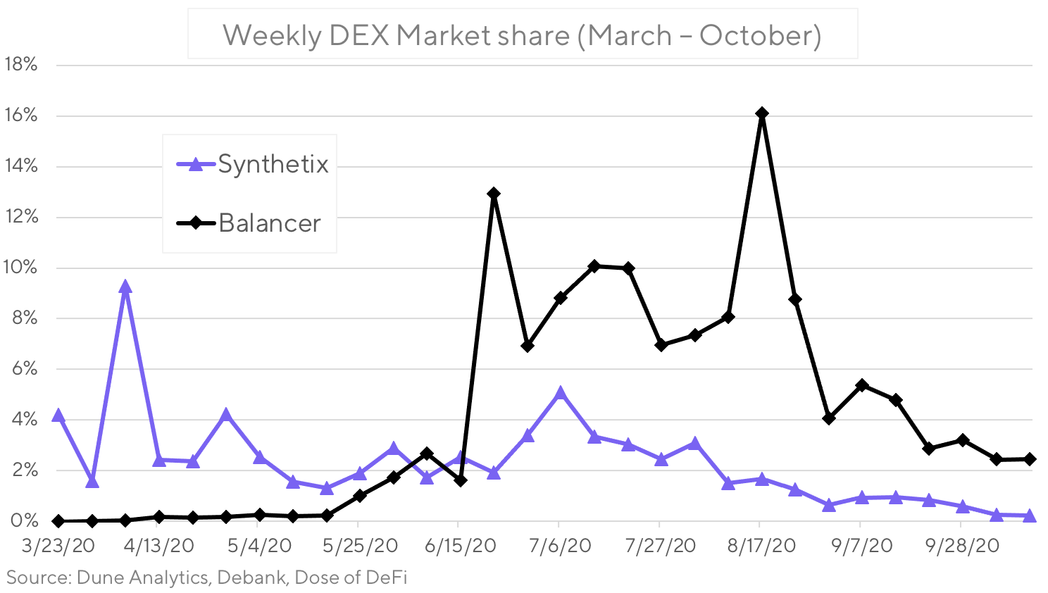 SNX, Synthetix’s token, has had a very good 6 months - up over 600%, but that has not been because of more volume on the Synthetix Exchange. Is Synthetix a decentralized exchange or a synthetic issuance platform? Balancer’s launch and liquidity mining campaign drove deposits and trade volume followed. Over the last 6 weeks, however, volume has plummeted. Balancer pools are more appealing to liquidity providers of volatile assets because of higher fees and flexible asset ratios, but it does not have consistent retail flow. It’s a secondary liquidity layer to Uniswap that arb bots can access when the price on Uniswap strays far enough to justify the higher trade fees. Both Balancer and Synthetix need to figure out how to attract more flow.