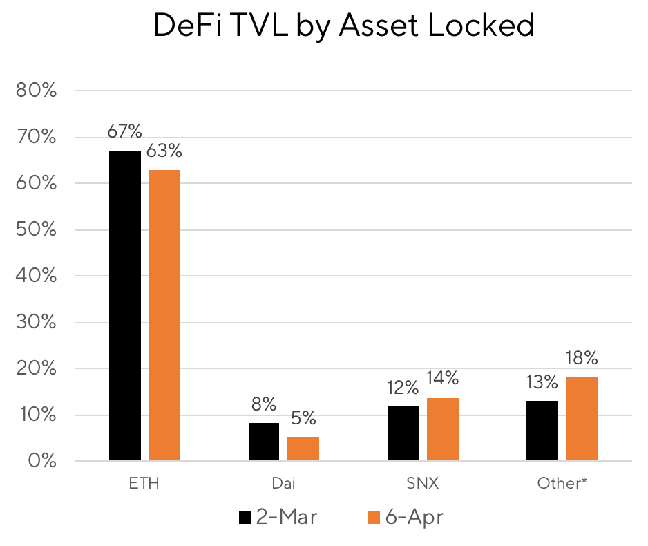 Lastly, the change in the asset makeup of DeFi over the past 5 weeks. The Dai decline is due to the liquidity shortage, while ETH’s decline can be attributed to the rise of “other” in two particular areas. 1. USDC inflows into Maker and 2. Additional collateral inflow from new tokens (like Aave).
