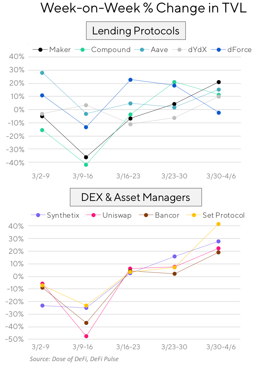 While all protocols are affected by the price of ETH, there are still variations between protocols. The chart below shows the week-on-week growth in the TVL of major DeFi protocols, broken up by lending protocols and DEXs/AMs.
