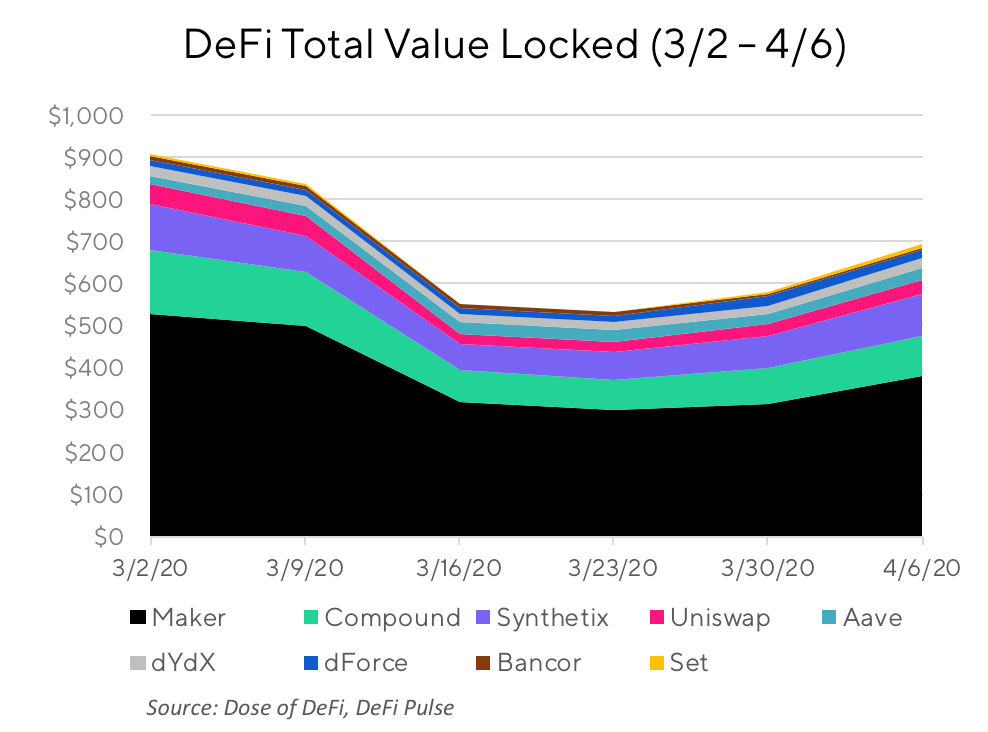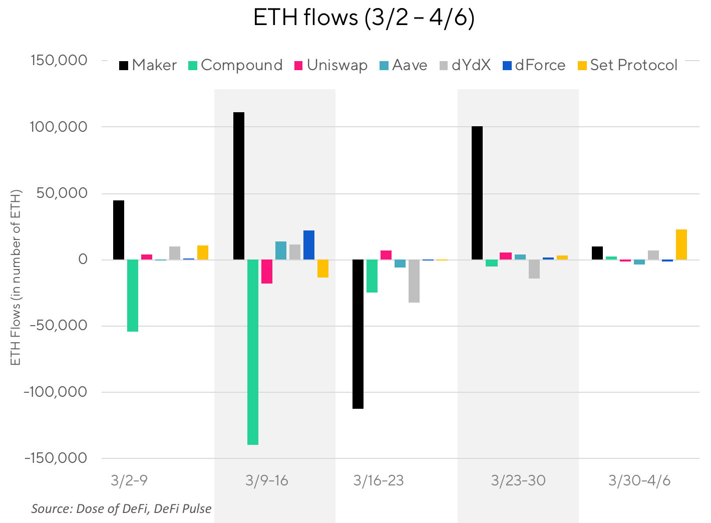 March 9 - 16 saw the most volatility - “Black Thursday” was March 12. Over that week, Maker saw 100k ETH flow into its protocol, much of it from Compound, which bled ETH over the first half of the month, seeing almost 200k flow out.