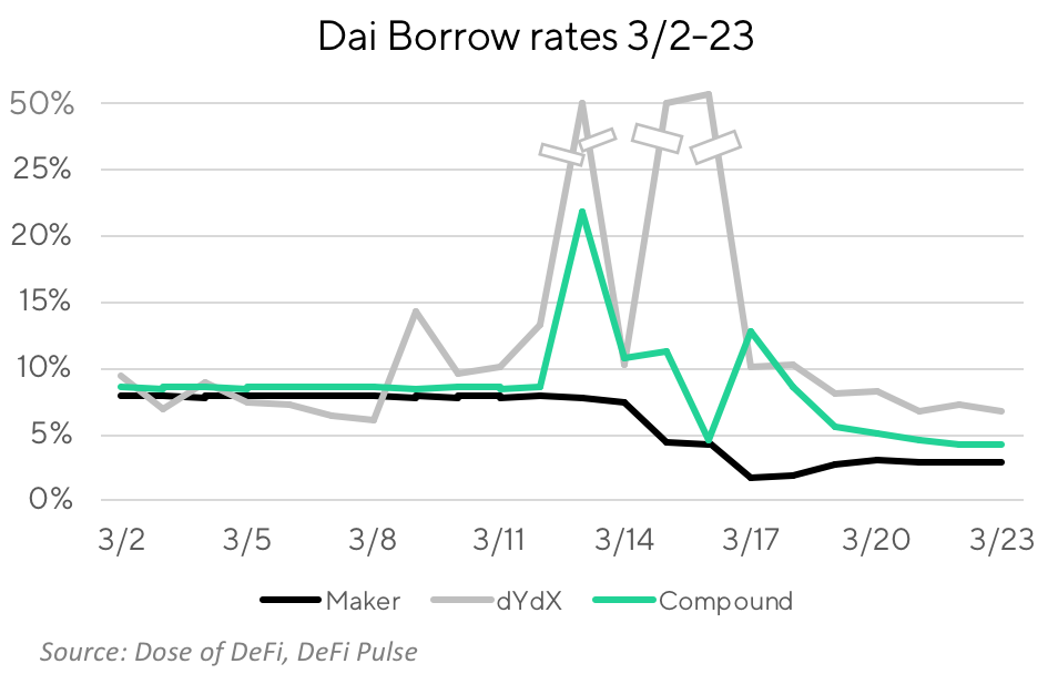 This was likely due to investors rebalancing their leverage. Given that most DeFi users are taking out a Dai or USDC loan, assets will flow to whatever protocol offers the lowest borrowing rates. As the market tumbled and Dai liquidity dried up, Maker’s Dai Stability fee kept stable at 8% (7.9% APR), while secondary lending platforms Compound and dYdX saw their Dai borrowing rates soar to 20%+ as utilization rates approached 100%.