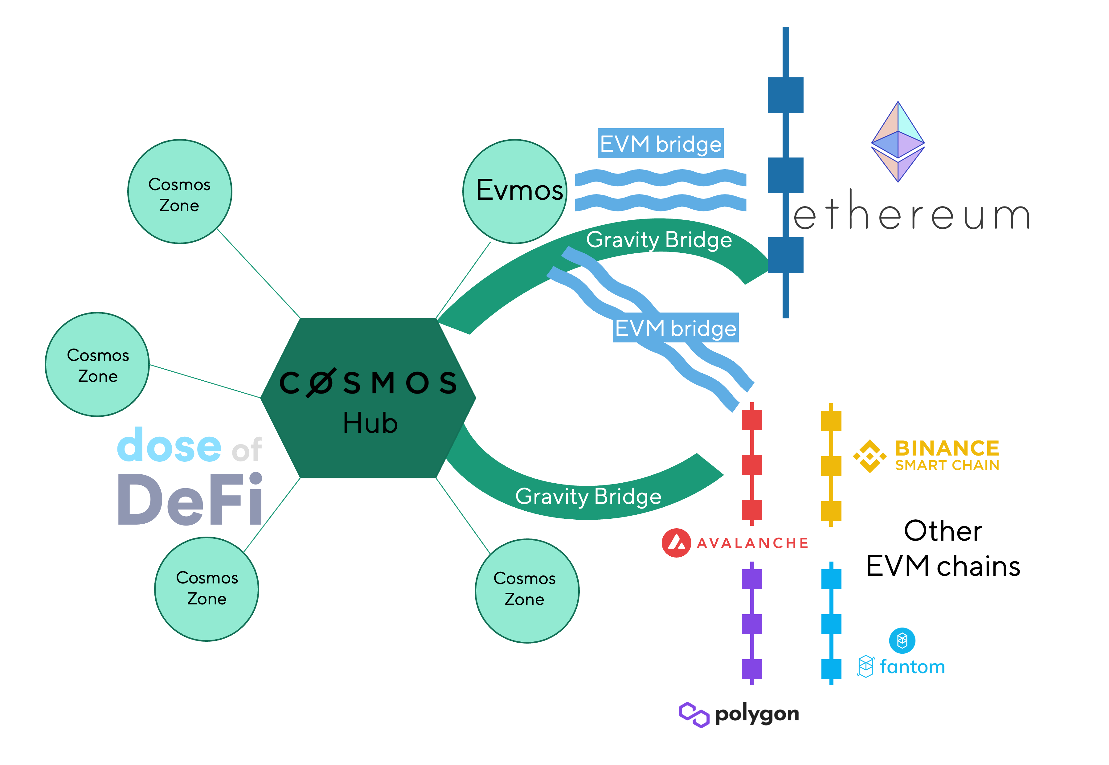 The EVM environment can become the onramp point for assets from EVM chains to these underlying chains. Users will choose whichever bridge is the most convenient and safest for them. The image below illustrates an example of Cosmos Hub and Evmos interacting with EVM chains.
