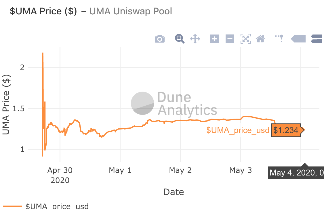 The sale did not yield immediate widespread distribution; only 291 addresses hold UMA tokens. In terms of price, the listing was a success. The token was listed at $0.26 but the first buys sent the price to over $2.00 before settling in the $1.25 range now, or 5x their listing price.