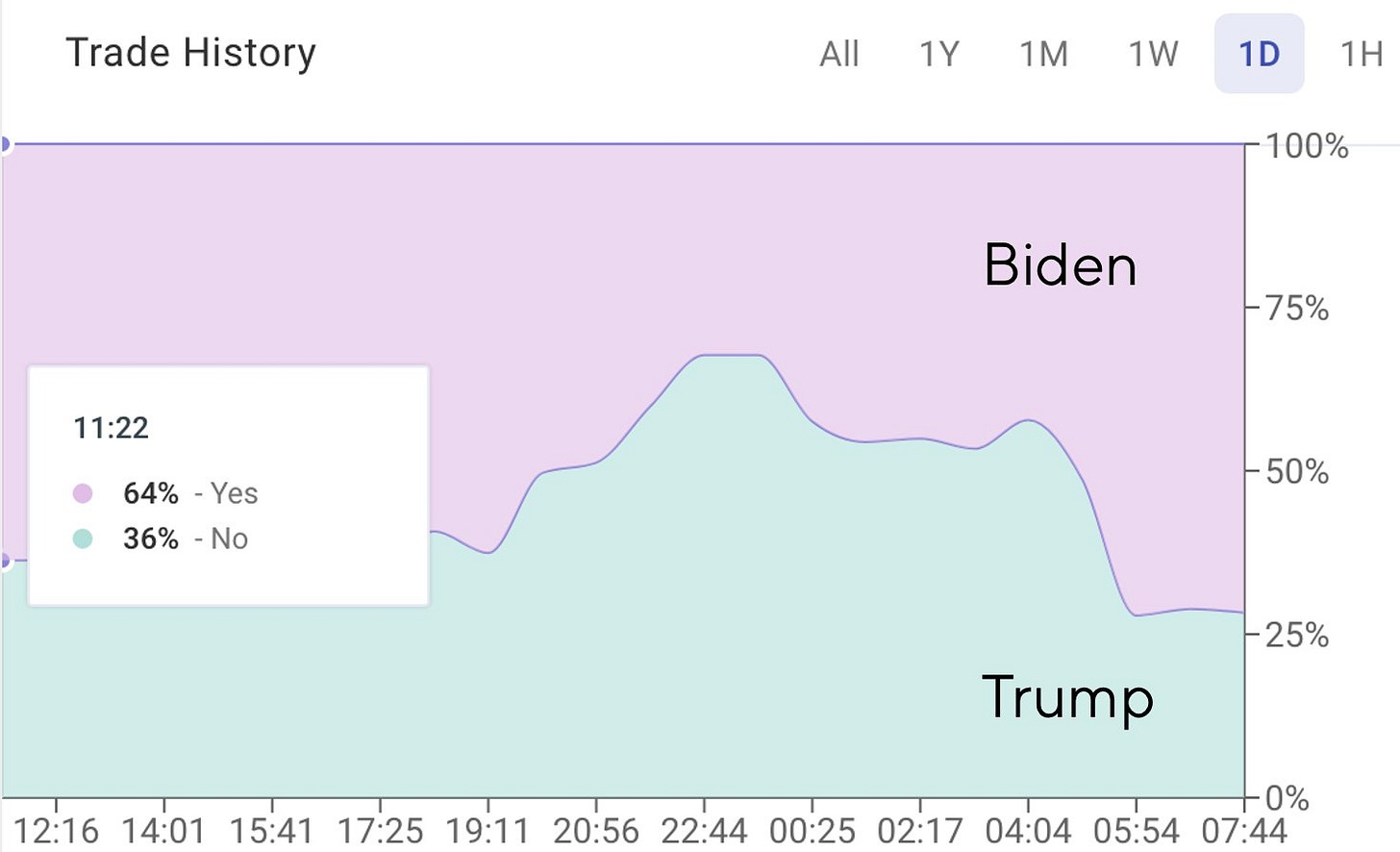 As low Biden vote totals in Miami-Dade County foreshadowed an early Trump victory in Florida, investors poured into Trump positions across all prediction markets, but then as WI, MI and PA numbers showed Biden was still in a strong position despite FL, traders quickly swooped up Biden shares at low odds.