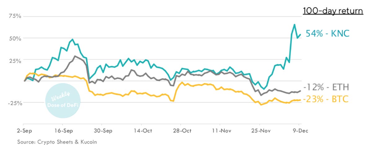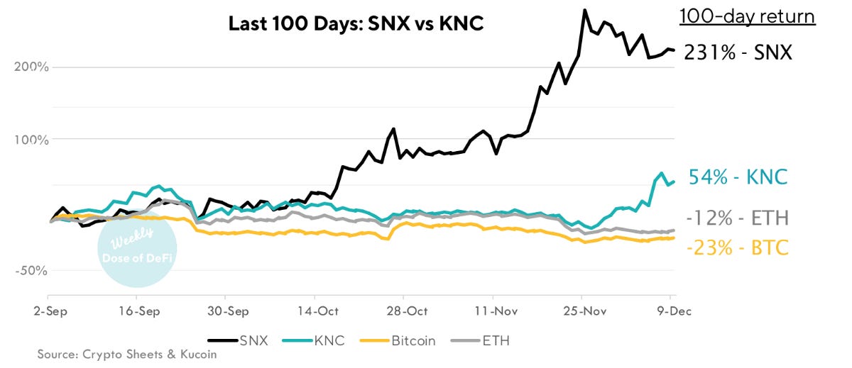 Below is the 100-day performance for the tokens of DeFi darlings Synthetix (SNX) and Kyber (KNC).