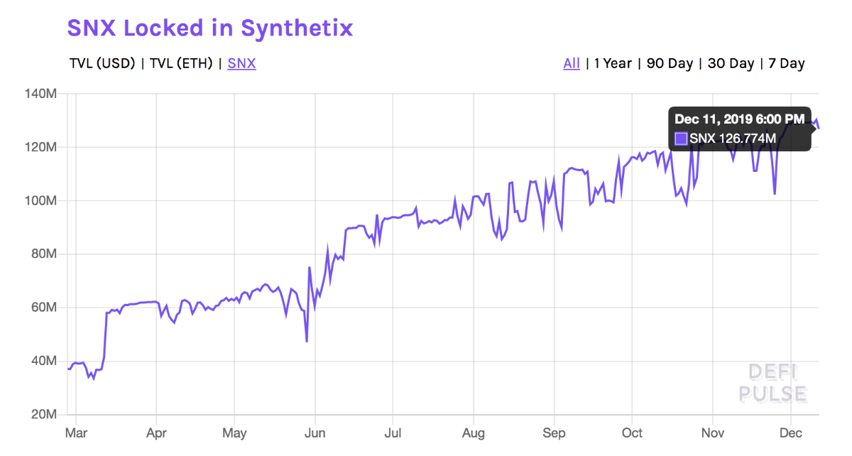 The strategy worked. The amount of SNX locked is on a steady climb with over 80% of SNX staked on the platform, according to DeFi Pulse.