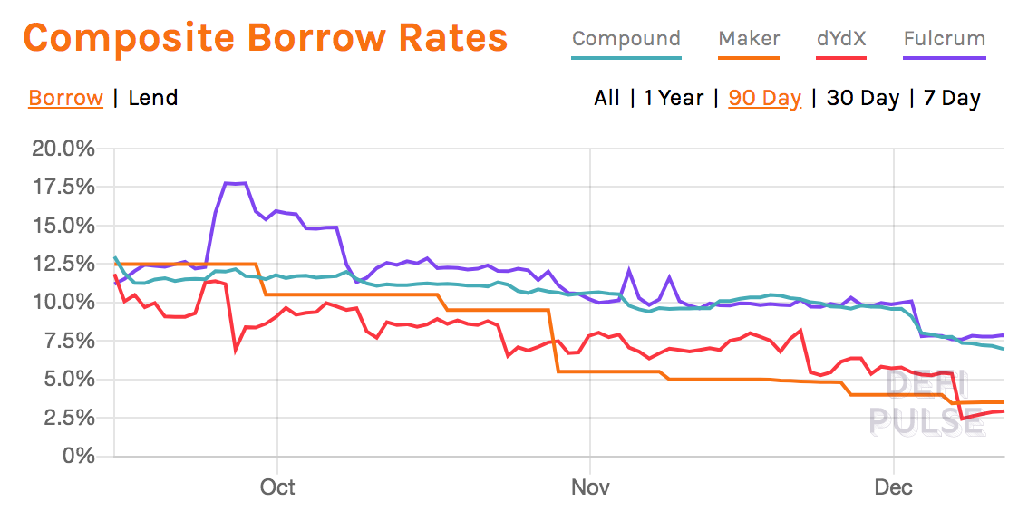 High deposit rates were considered a mainstream DeFi product, but lending rates have plummeted since the summer. Maker has consistently lowered the Dai stability fee over the last few months and the market followed. Low interest rate environment is good for traders but bad for the DeFi apps trying to compete with bank deposit rates.