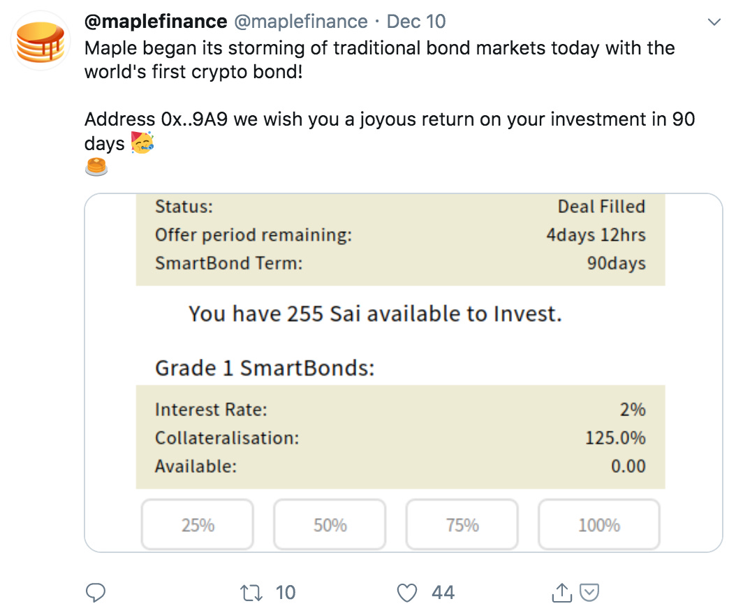 New DeFi entrant Maple launched their SmartBonds protocol onto the Ethereum Mainnet last week. They announced on Twitter what they are calling the 'world's first crypto bond'. Maple aims to bring fixed-rate lending and allow hedging against changes in future interest rates.