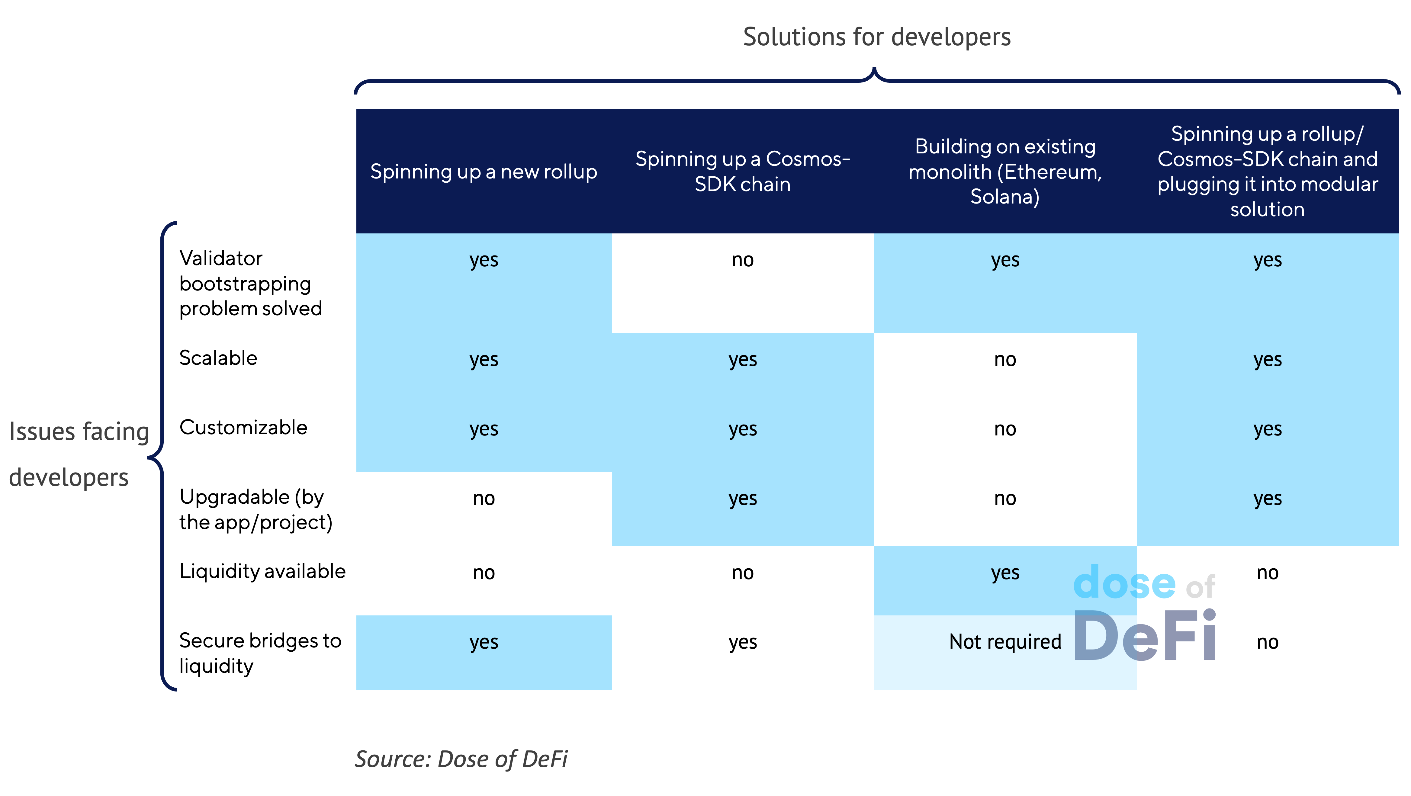To summarize: modular blockchains bring scalability, full control, chain customization, and savings on validator bootstrapping. Yet still there are tradeoffs: namely in liquidity and cross-chain security. We expect to see modular blockchains occupy the niche of highly-customizable solutions for technically-advanced teams on one end of the spectrum, and for small, cost-conscious teams on the other.